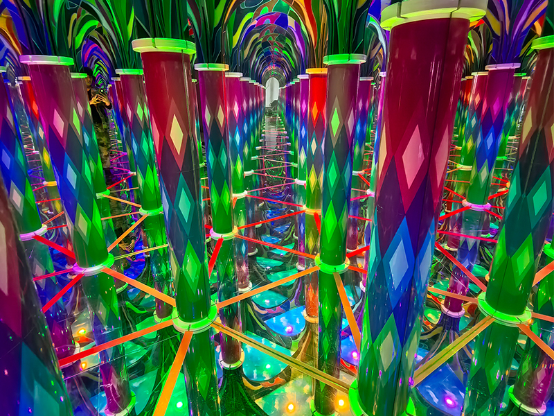 镜子迷宫游乐设备是一个根据平面镜成像原理设计、令我们产生视错觉的迷宫。迷宫由数以百计的镜子组成,并参照了诸葛亮的八卦阵进行布局。结合了绚丽的万丈深渊作为地面处理,每一步都让人走的惊心动魄。